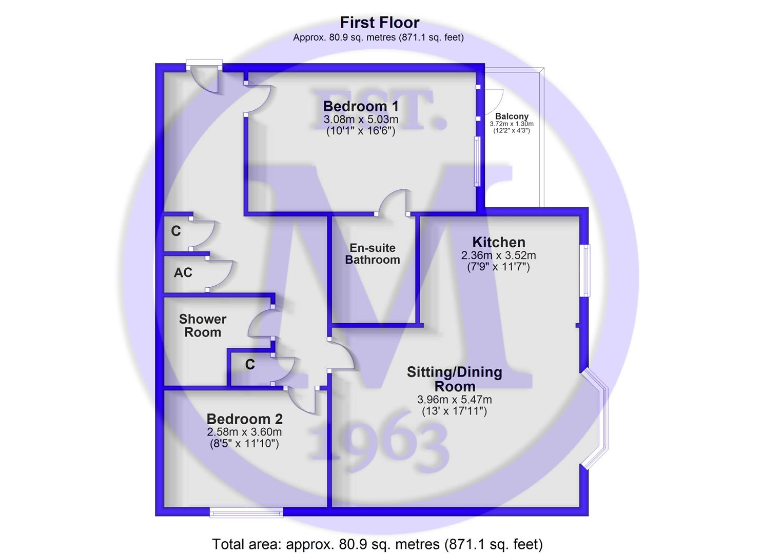 Two double bedrooms, with the master bedroom benefitting from a balcony with a lovely rear outlook and a recently installed en-suite bathroom fitted with a white suite comprising a panel bath with mixer tap, independent shower and glass screen, wash basin with storage beneath, WC, tiled flooring, recessed ceiling spotlights, extractor fan, and a chrome ladder style heated towel rail.
