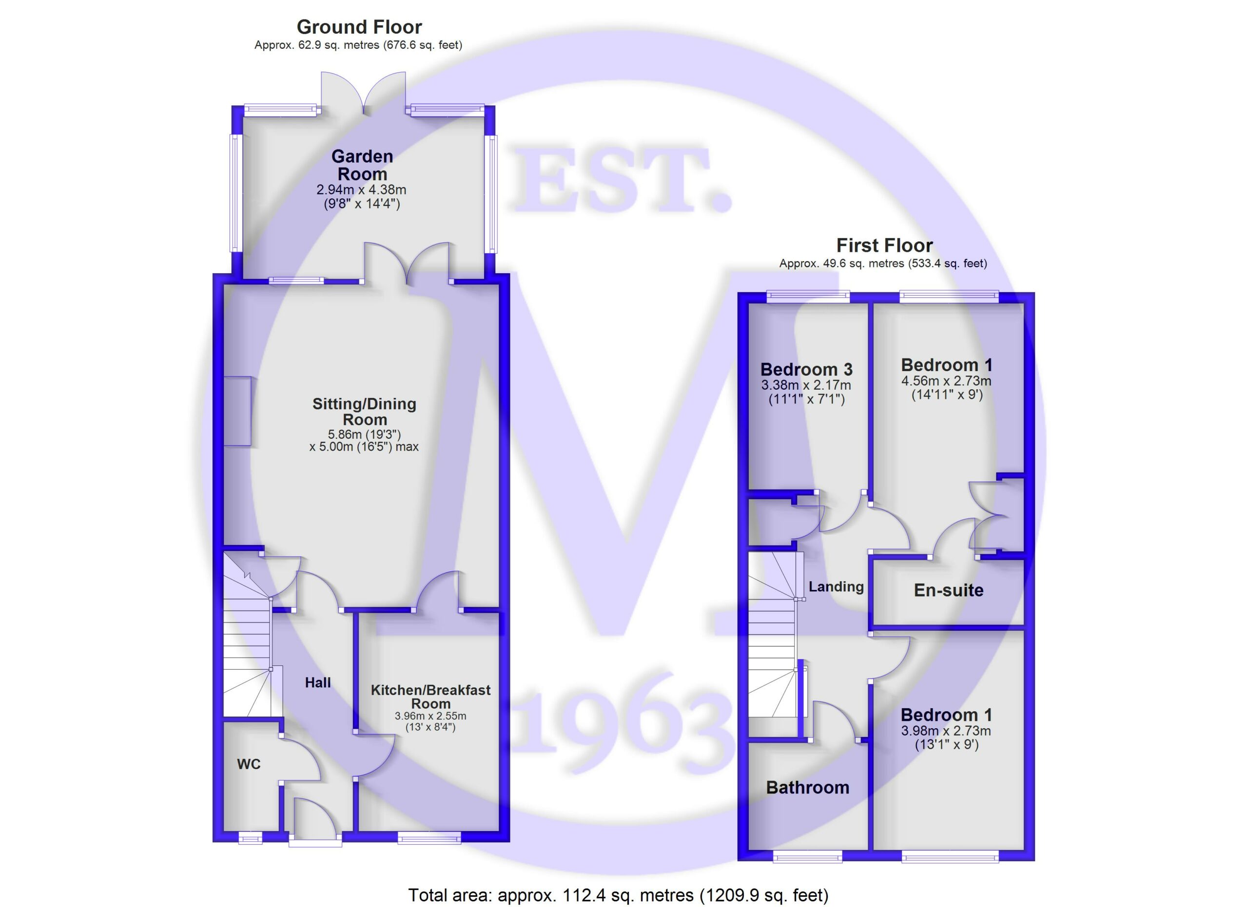 The sitting/dining room is particularly spacious, with an understairs storage cupboard, a feature fireplace with stone surround and inset electric fire, a TV aerial point, a smooth textured ceiling, and double casement doors leading to the garden room.