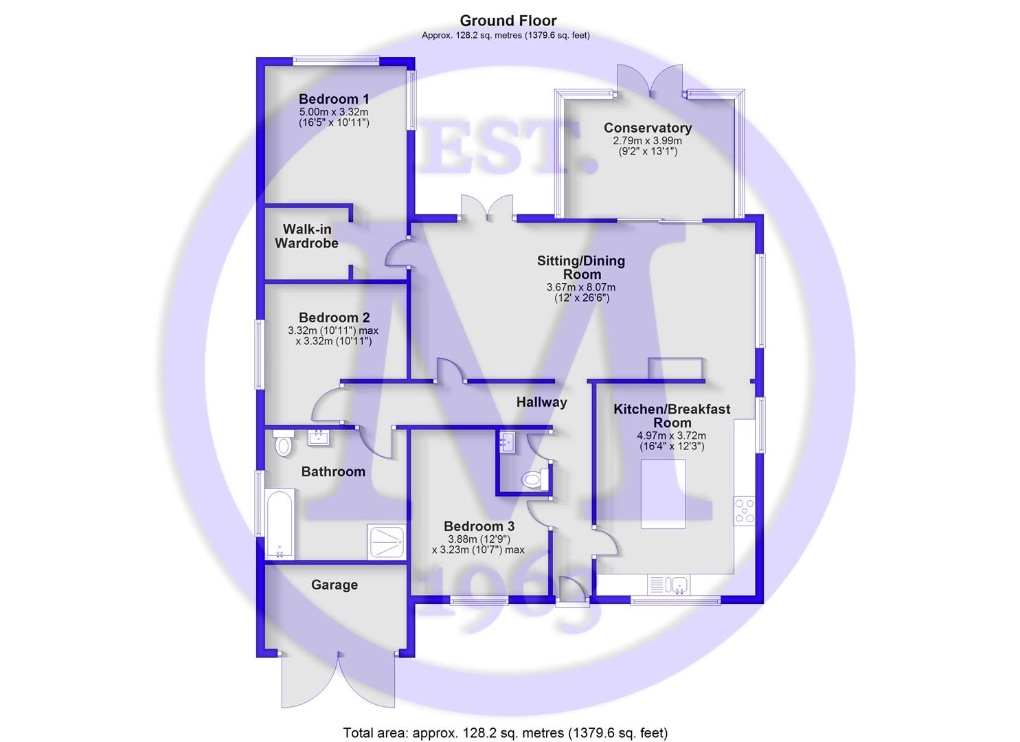 The sitting/dining room is particularly spacious, with double casement doors opening onto the rear garden, a timber effect floor, recessed ceiling spotlights, and a feature fireplace.