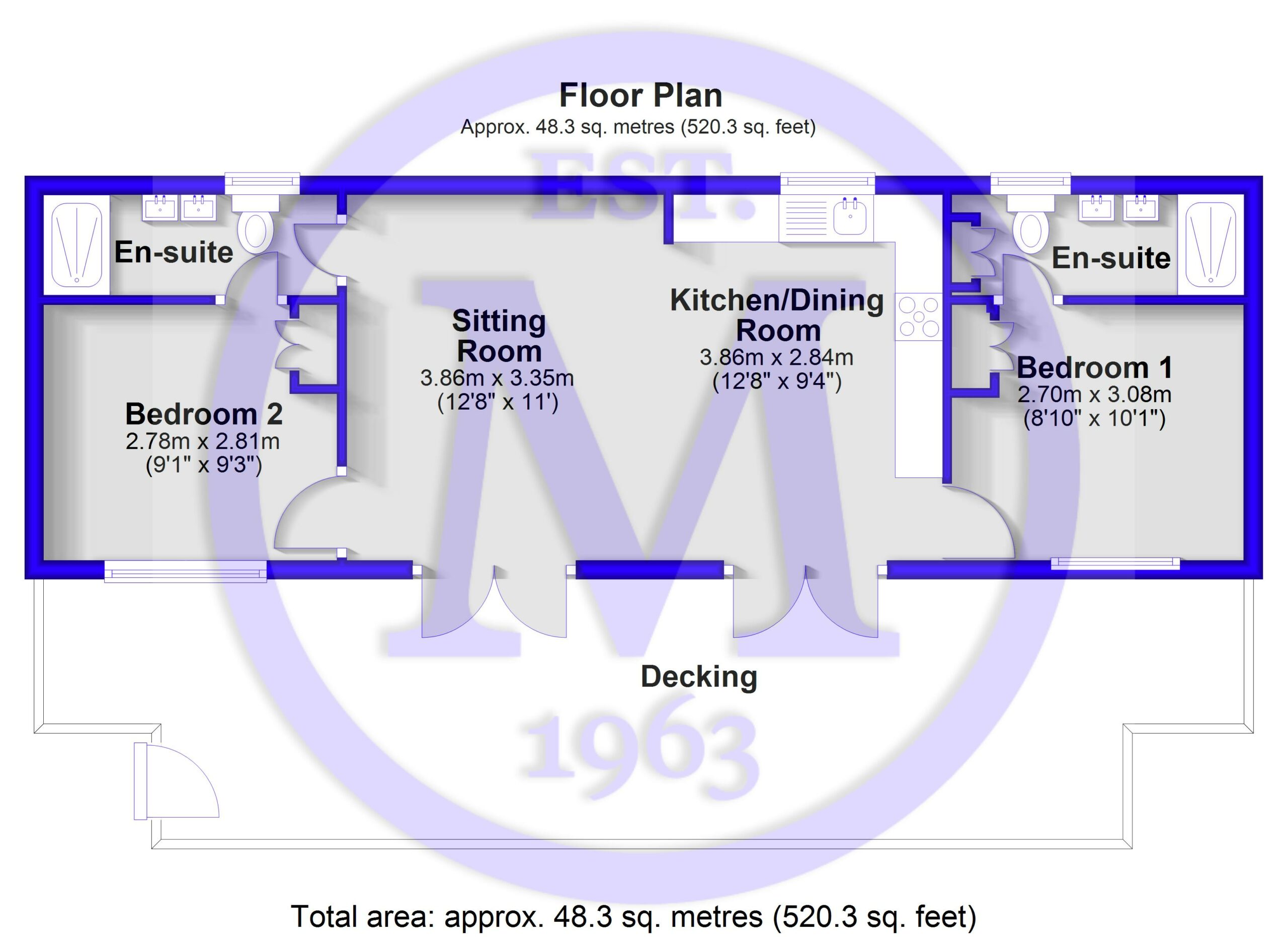 Bedroom one is a super king sized room with a window overlooking the decking, matching bedside units, a dressing table with drawers, a double wardrobe, a wall mounted TV, and a door leading to the en-suite shower room.