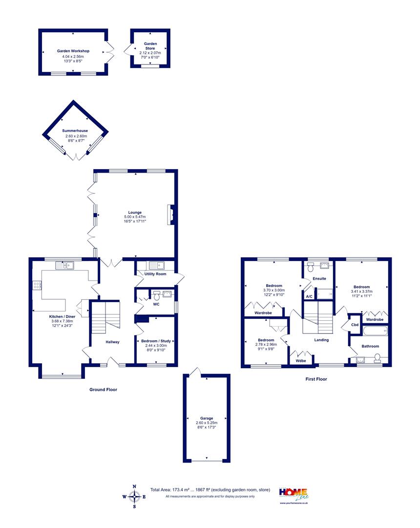 Summerhouse, garden workshop and garden store, all with light and power