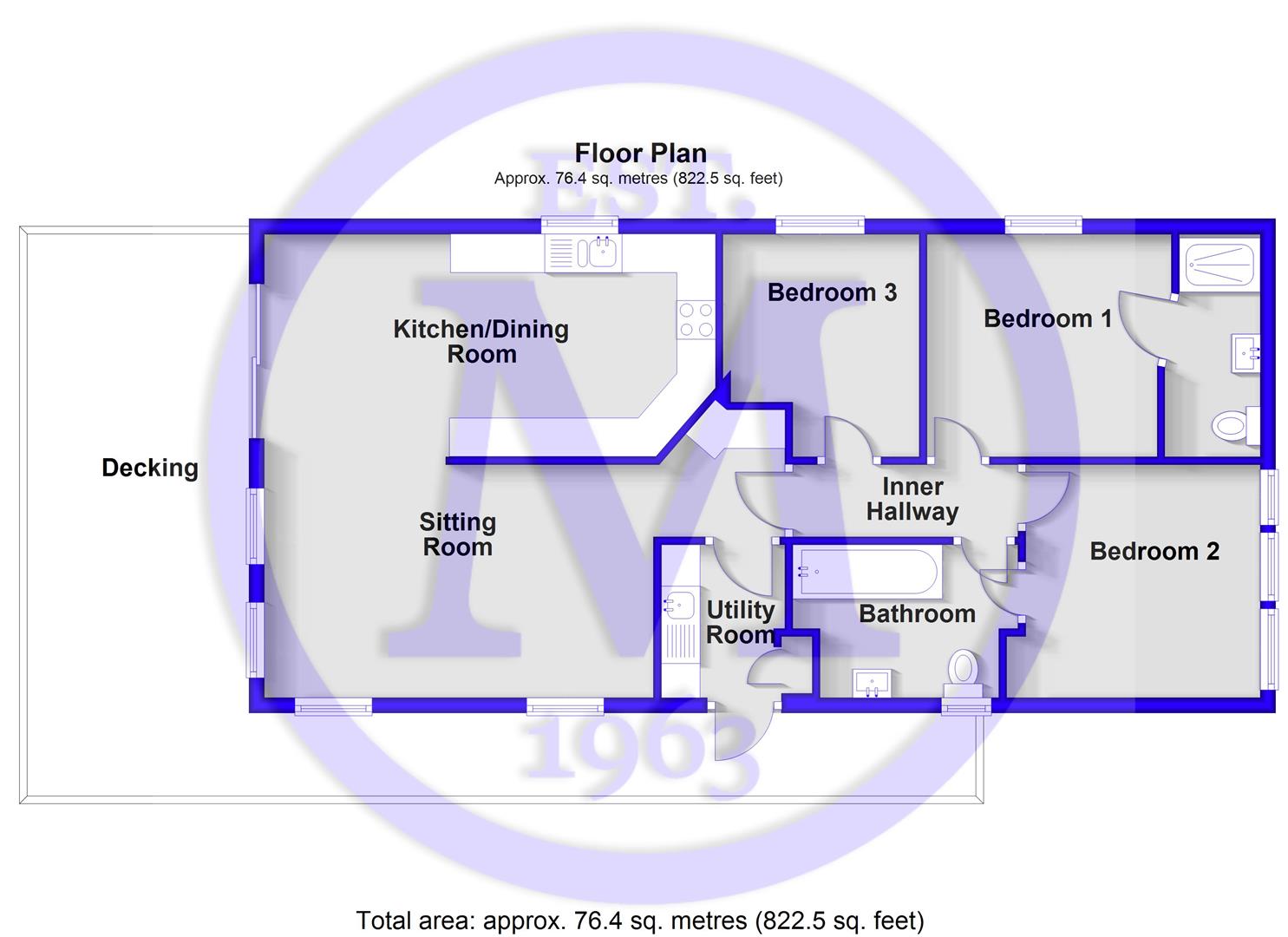 The kitchen/dining room has tile effect flooring, sliding doors onto the south facing decking, a six seater dining table and chairs, a pleasant dual aspect, and a kitchen with modern cream wall and base units offering ample storage, and a contrasting marble effect worktop. There is a one and a half bowl stainless steel sink unit with mixer tap and drainer, a four burner gas hob, a raised electric oven, an integrated microwave and fridge/freezer, and a slimline dishwasher.