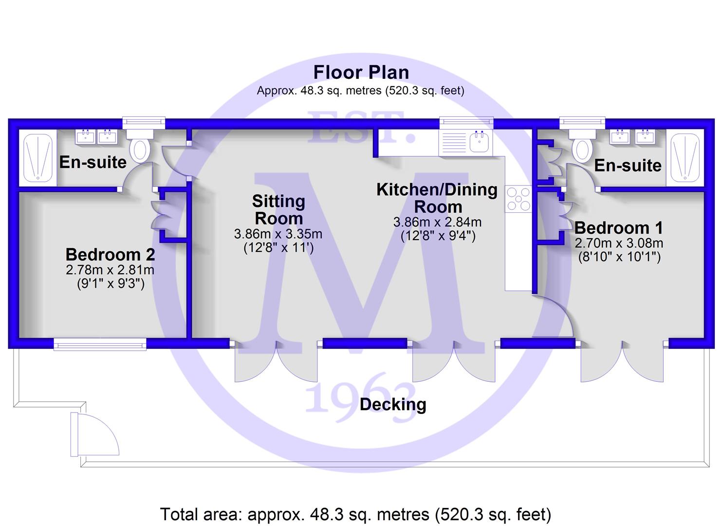 Bedroom one is a king sized room with double casement doors onto the decking, matching bedside units, a dressing table with drawers, a double wardrobe and a door leading through to the en-suite shower room.