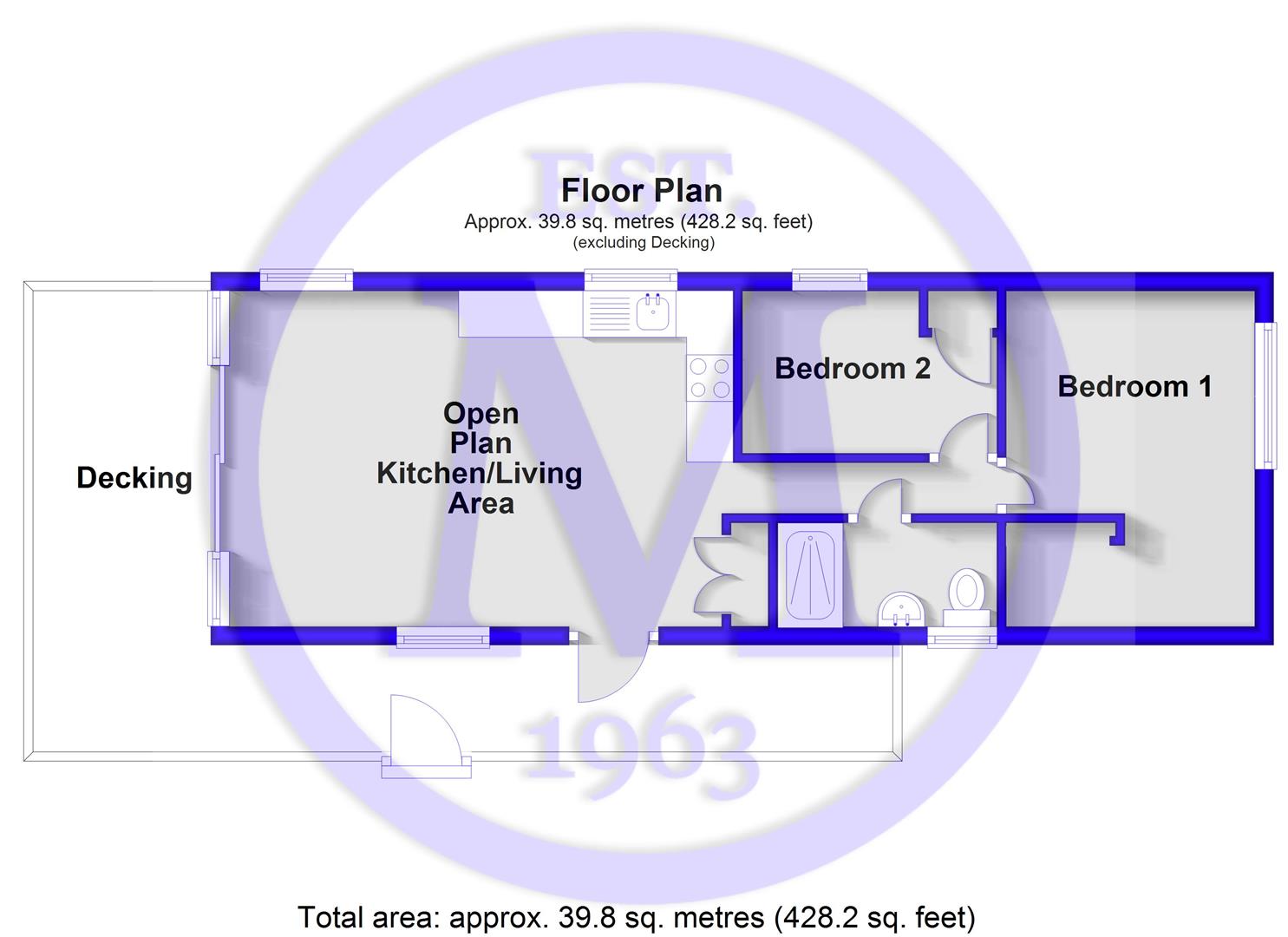 The sitting room benefits from carpeted flooring and a pleasant triple aspect, with sliding doors leading onto the decking, fitted storage, and a two piece suite.
