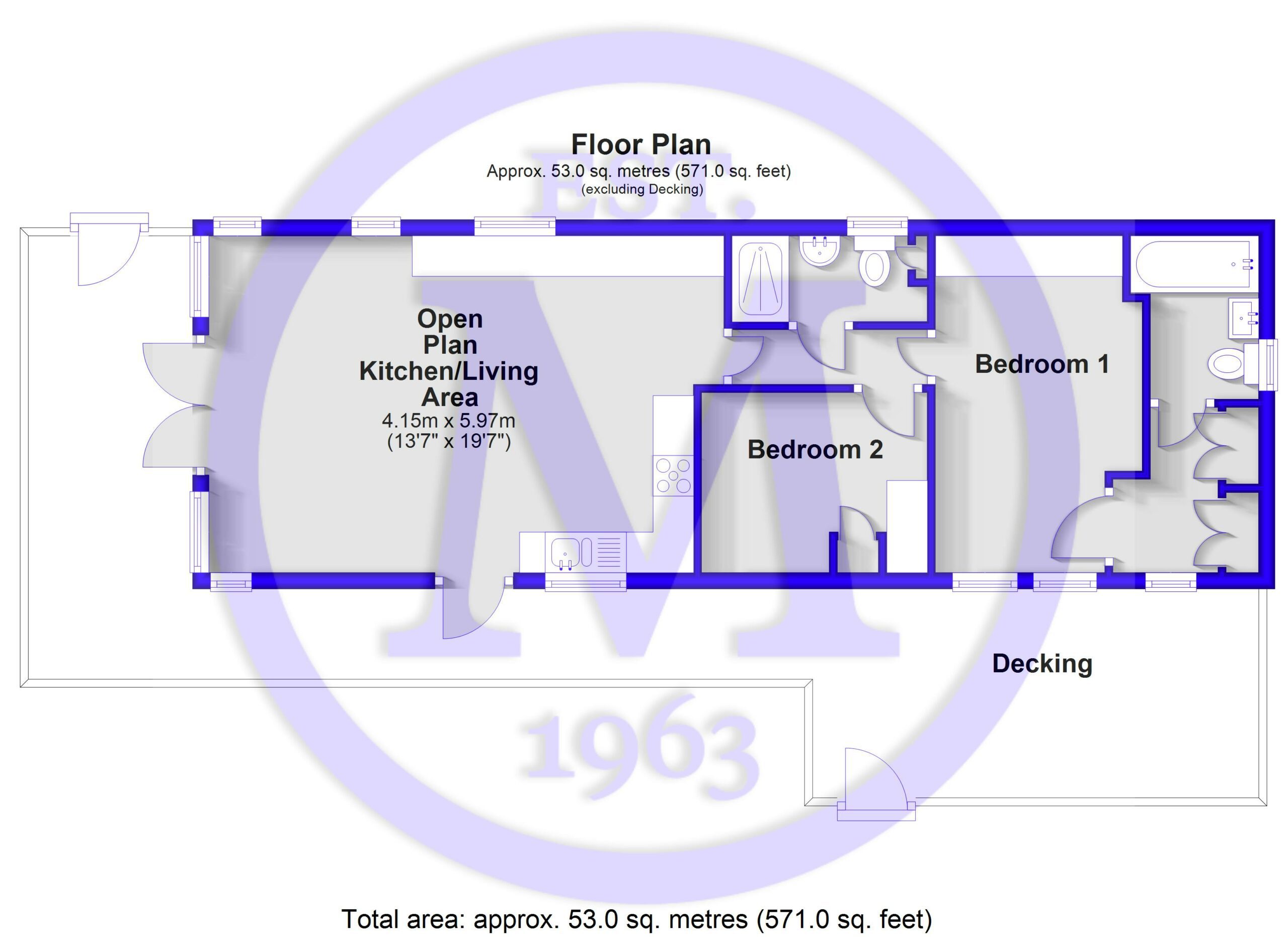 The sitting room has double casement doors opening onto the decking, two large sofas with one being a sofa bed making the holiday home sleep six, and a feature fireplace with an electric fire.