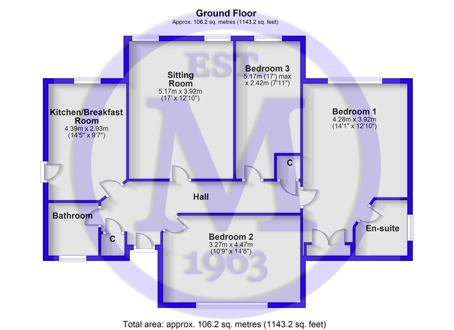 Three double bedrooms, two of which have built-in wardrobes. The large master bedroom benefits from a luxury en-suite shower room comprising a fully tiled corner shower cubicle, wash basin with storage beneath, WC, tiled flooring, recessed ceiling spotlights, a chrome ladder style heated towel rail, and an extractor fan.