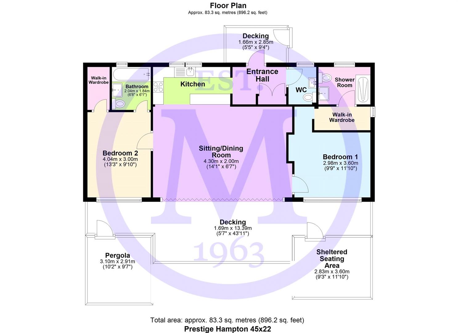 To the front of the property is a large area of decking which adjoins the sitting/dining room and both bedrooms. The lodge also benefits from a sheltered seating area, pergola and allocated parking.