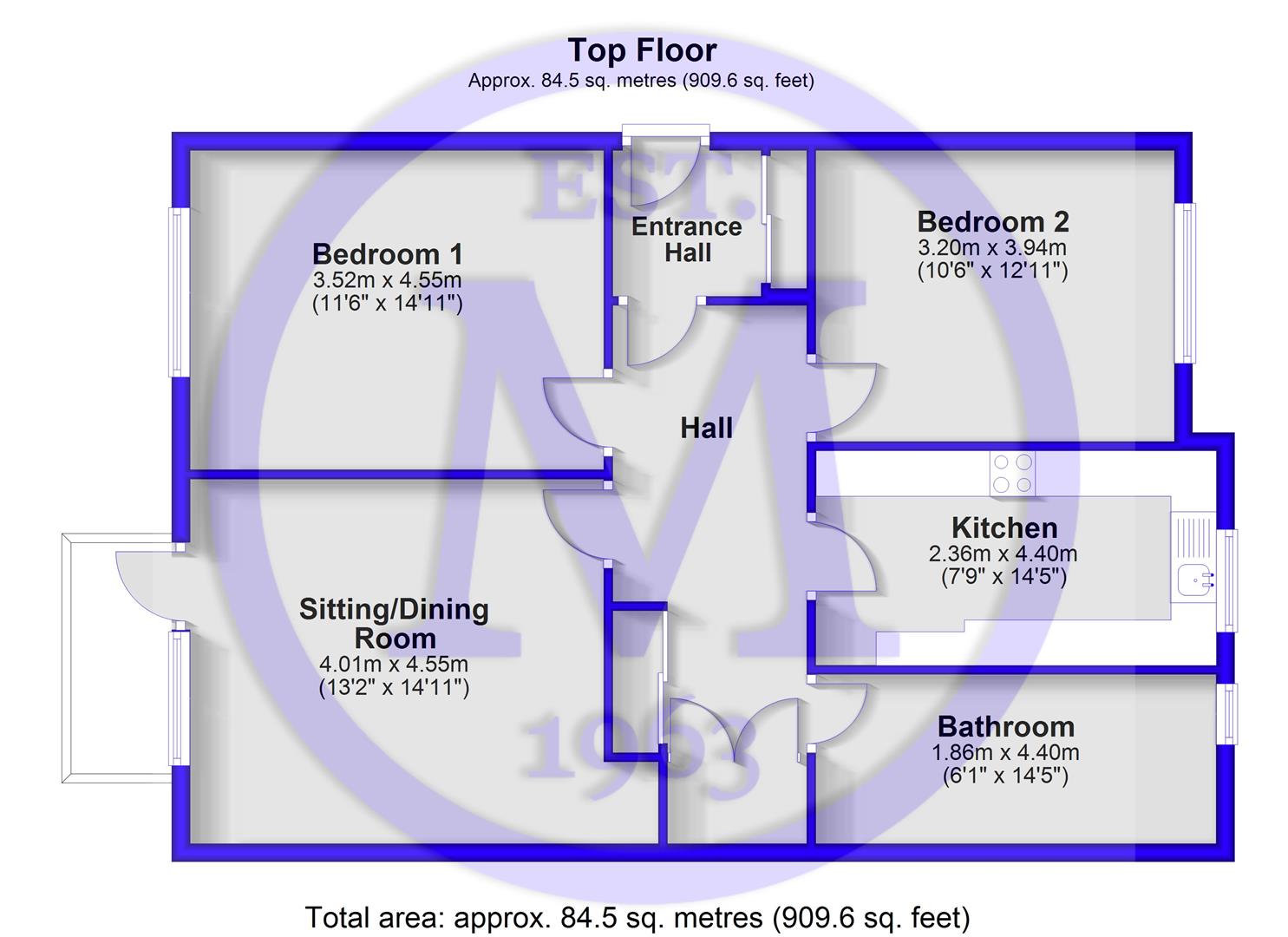 Entrance hall with double coats cupboard housing the electric meter, electrical consumer unit, and gas meter, radiator, and a glazed door leading through to the hall.