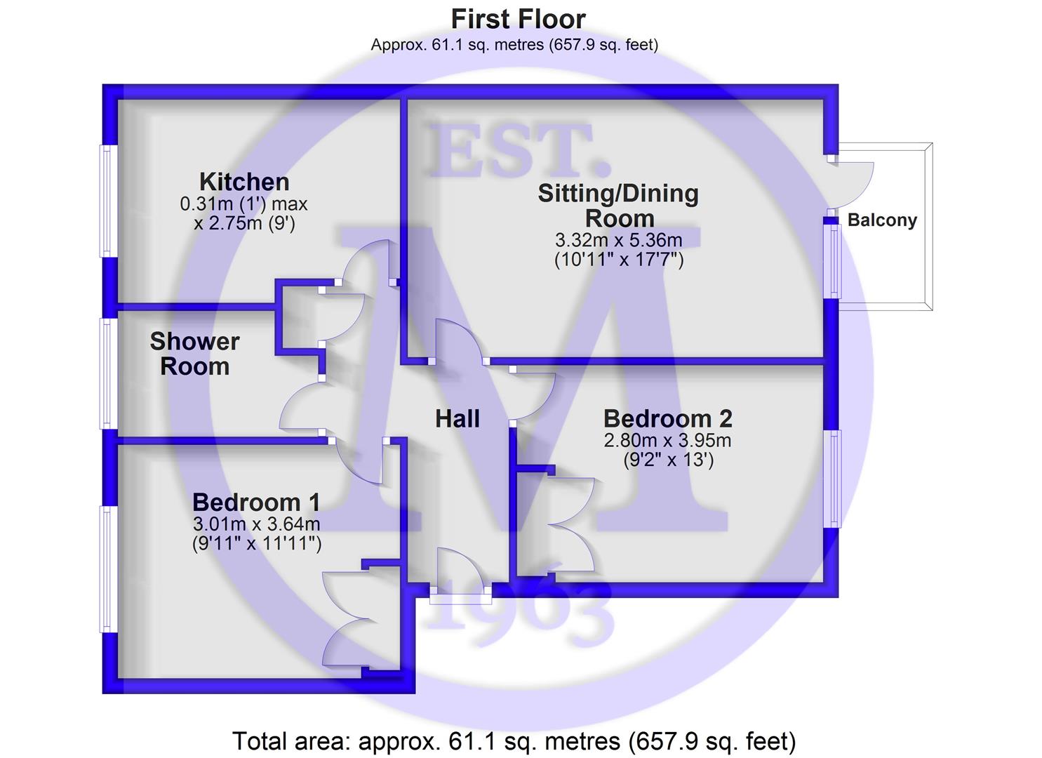 The balcony consists of wrought iron railings and measures approximately 2m x 1.2m.