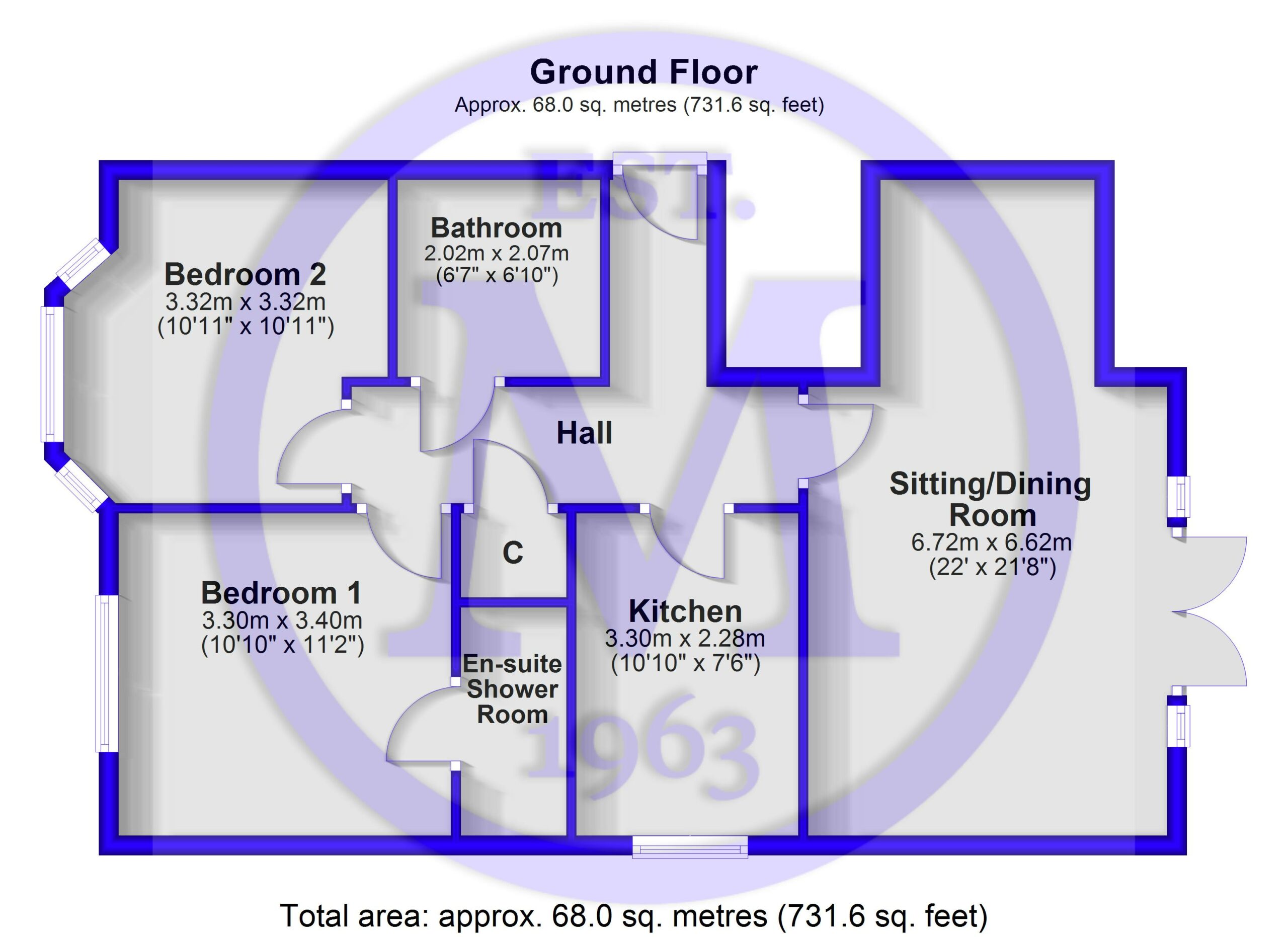 Two double bedrooms, one featuring a bay window, with the main bedroom benefiting from an en-suite shower room comprising a fully tiled shower cubicle, wash basin, WC, and towel rail.