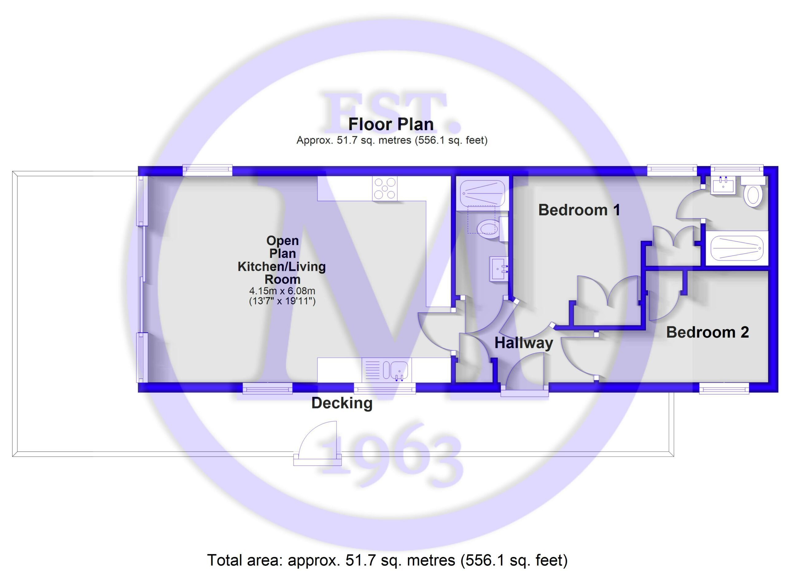 The spacious open plan kitchen/living area benefits from a bright triple aspect with sliding doors onto the decking, a feature fireplace, and a four seater dining table with chairs. The kitchen is fitted with an impressive range of shaker style wall and base units, a contrasting marble effect worktop and a continuation of the tile effect flooring. It includes a one and a half bowl sink unit with mixer tap and drainer, a five burner gas hob, raised electric ovens, and an integrated microwave, fridge/freezer, dishwasher, washing machine, and extractor fan.
