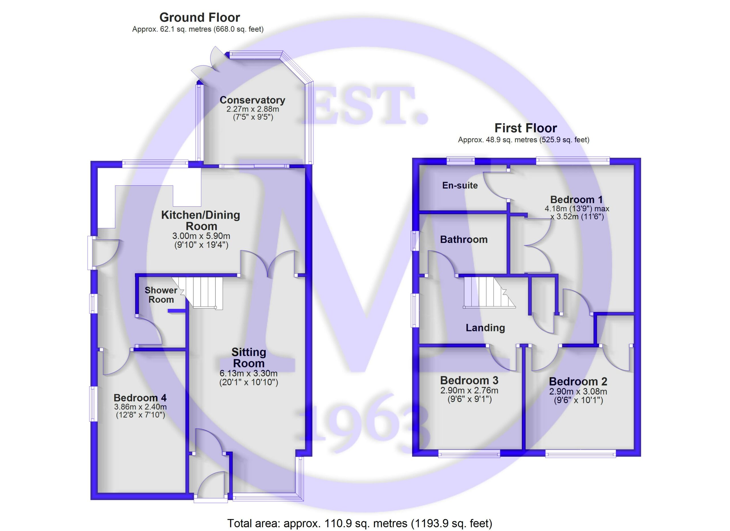 Three first floor double bedrooms, with the master bedroom featuring two double built-in wardrobes and an en-suite shower room fitted with a modern white suite comprising a fully tiled shower cubicle with a thermostatically controlled shower, a wash basin with storage beneath, a WC, a chrome ladder style heated towel rail, recessed ceiling spotlights, an extractor fan, and tiled flooring.