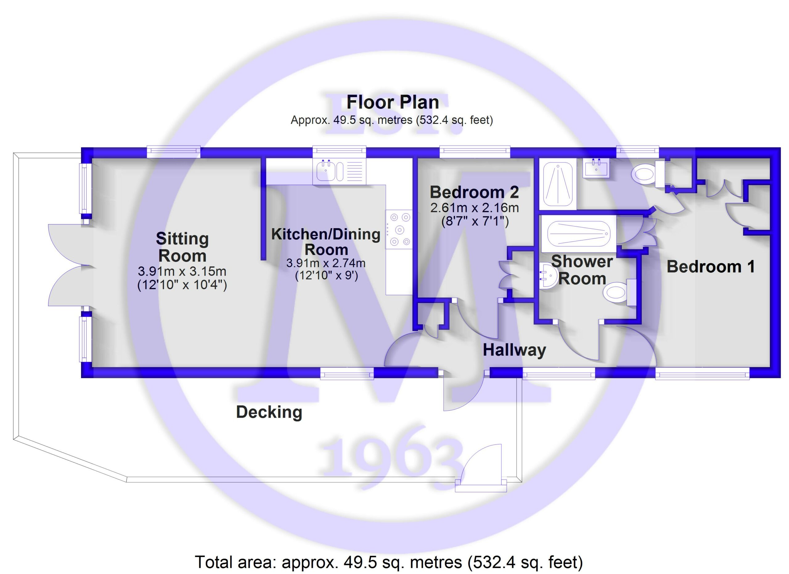 The sitting room enjoys a pleasant double aspect with fitted furniture, a corner sofa with a pull-out bed, and casement doors opening onto the wraparound decking.